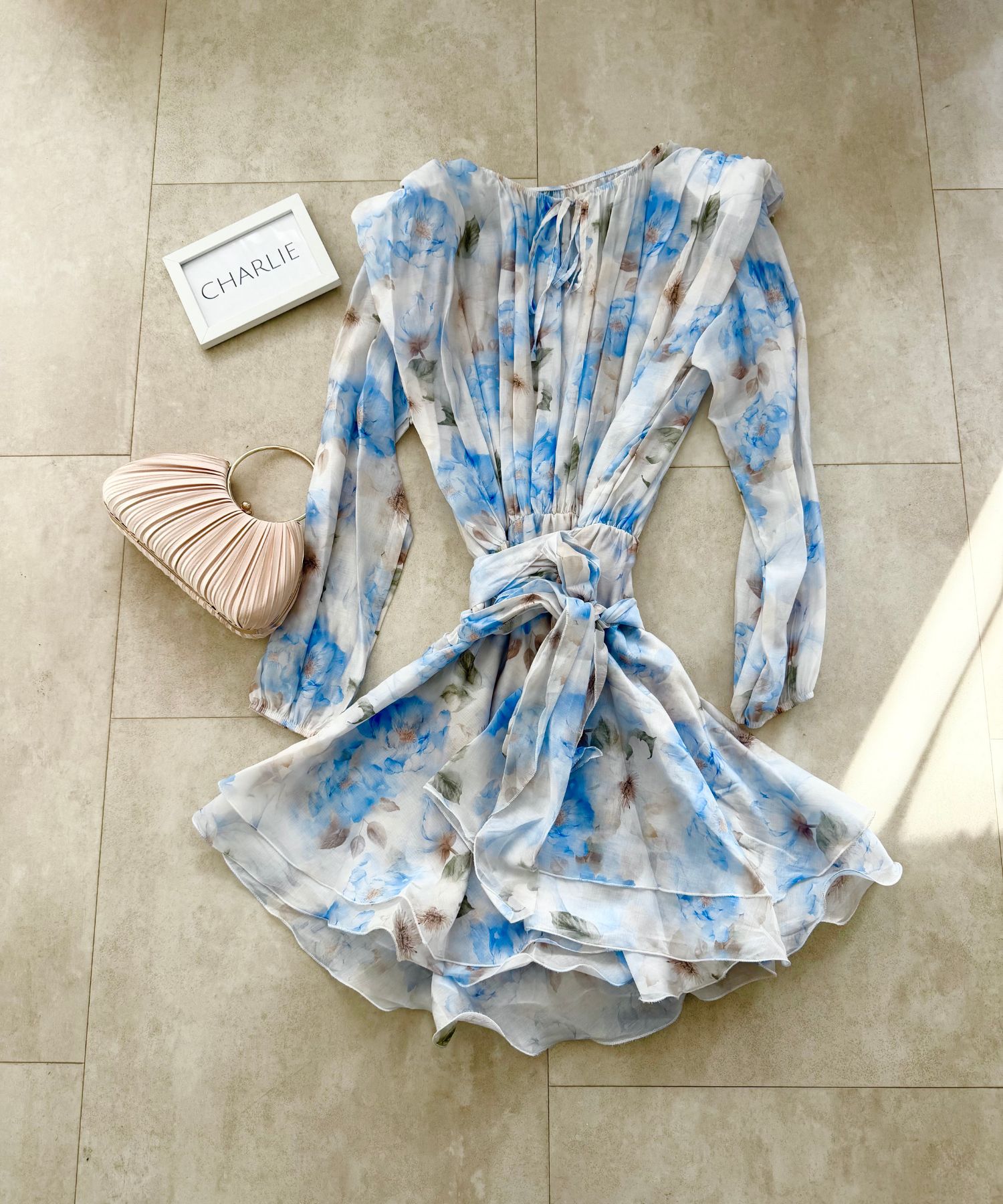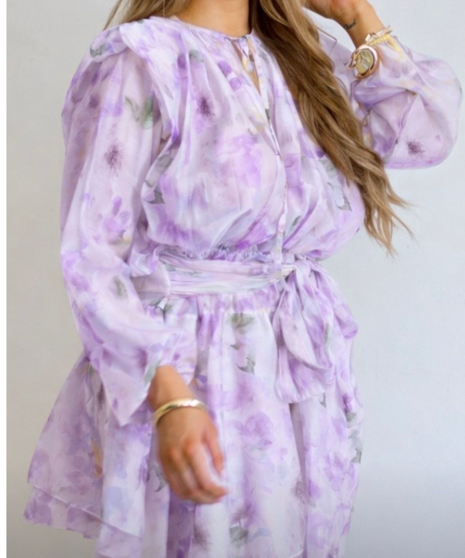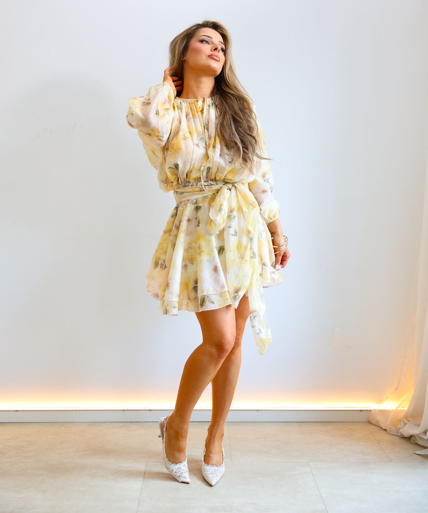 • Haljina ima gumu u struku i veže se s pojasom.