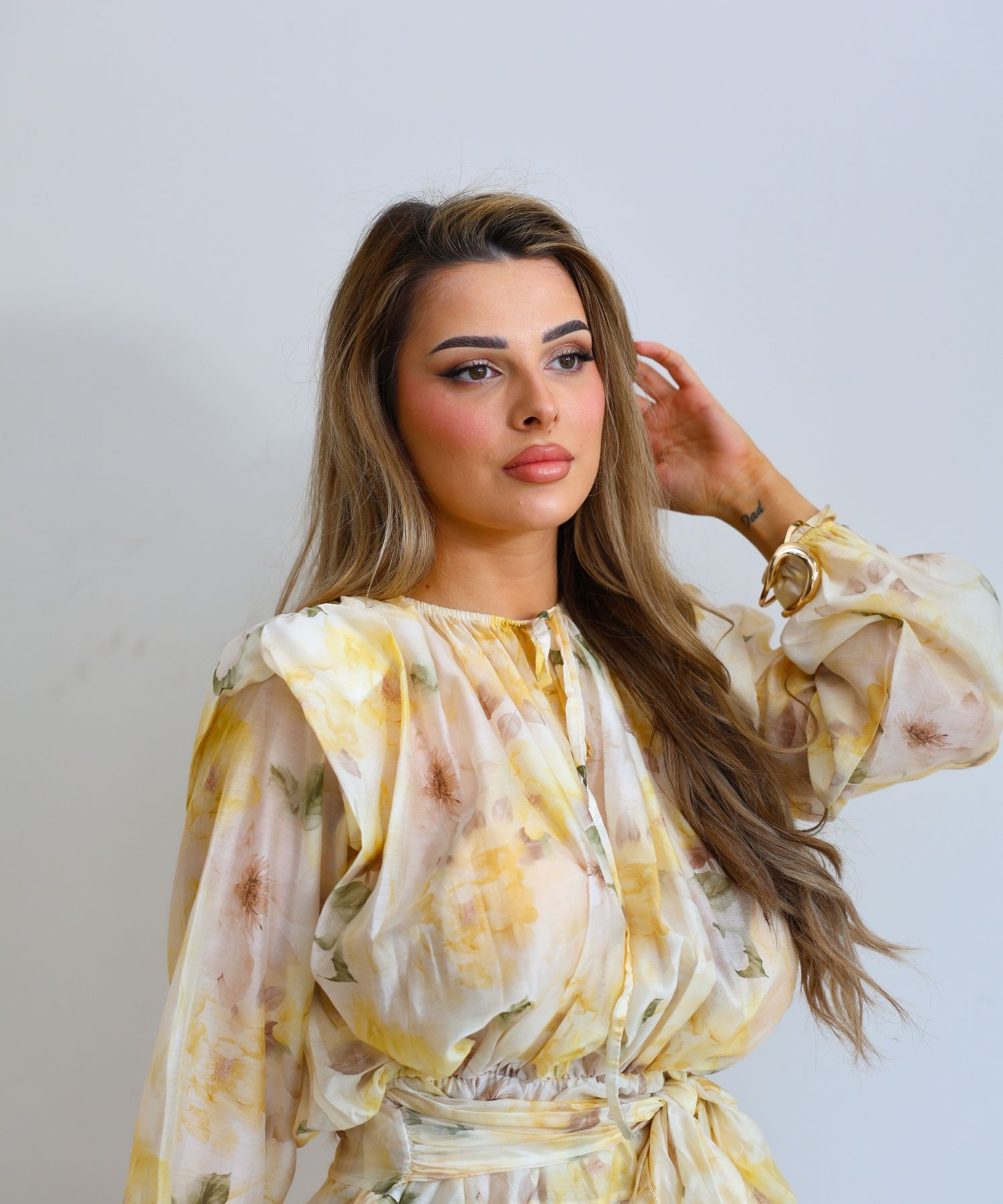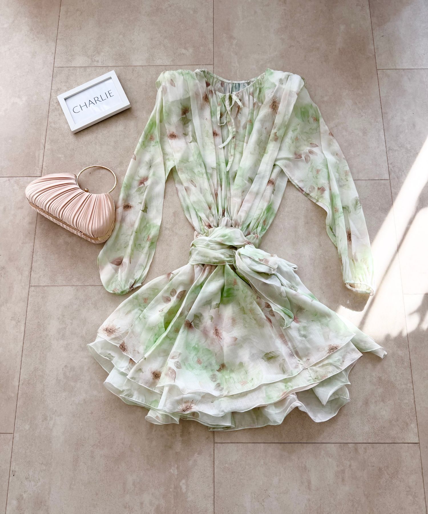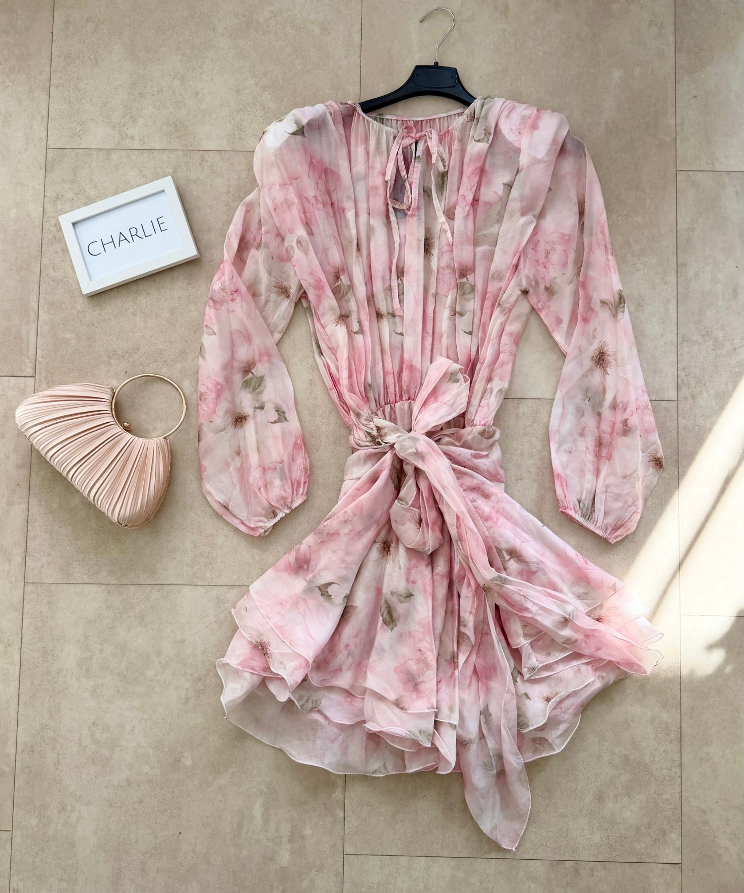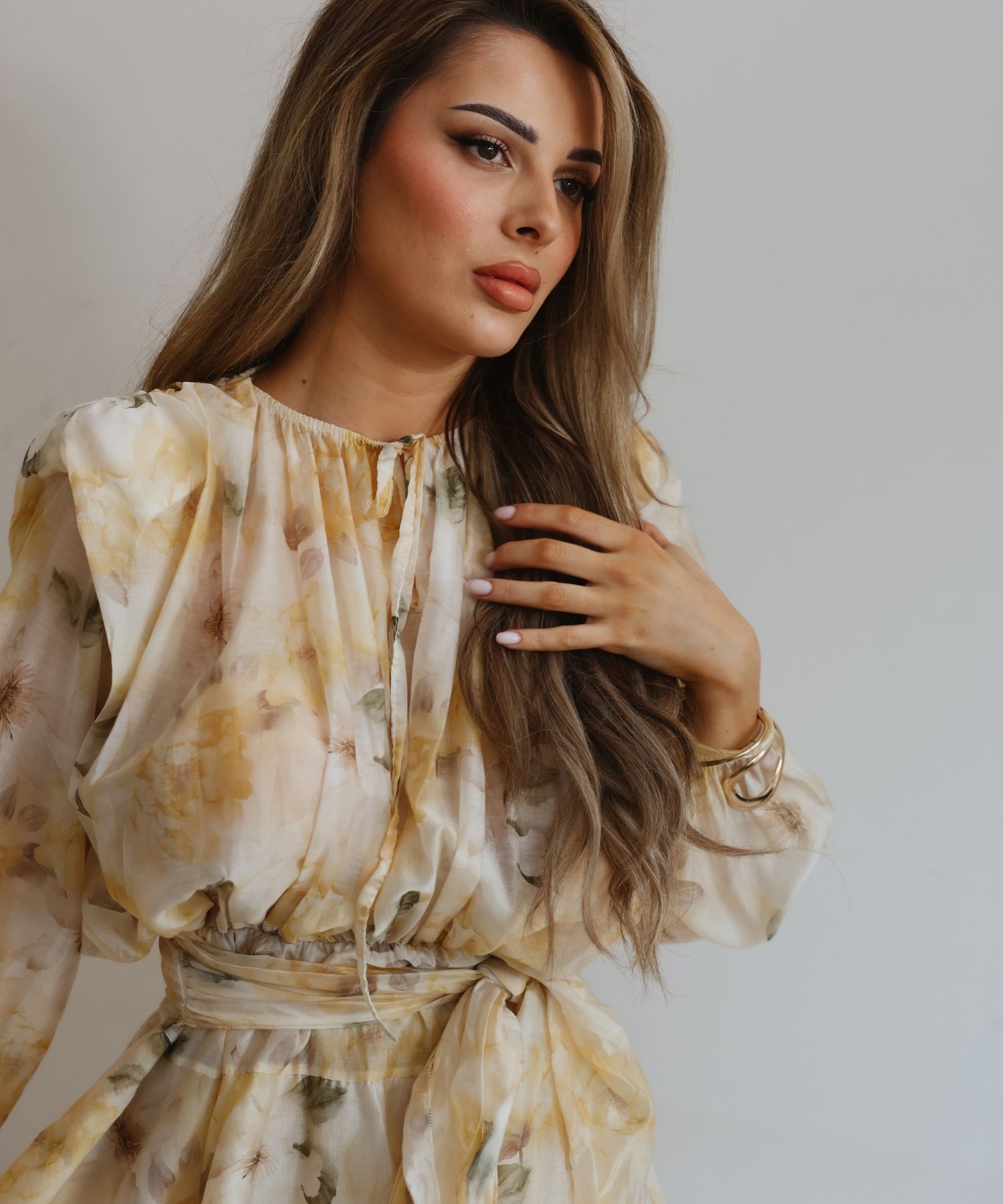 • Haljina ima gumu u struku i veže se s pojasom.